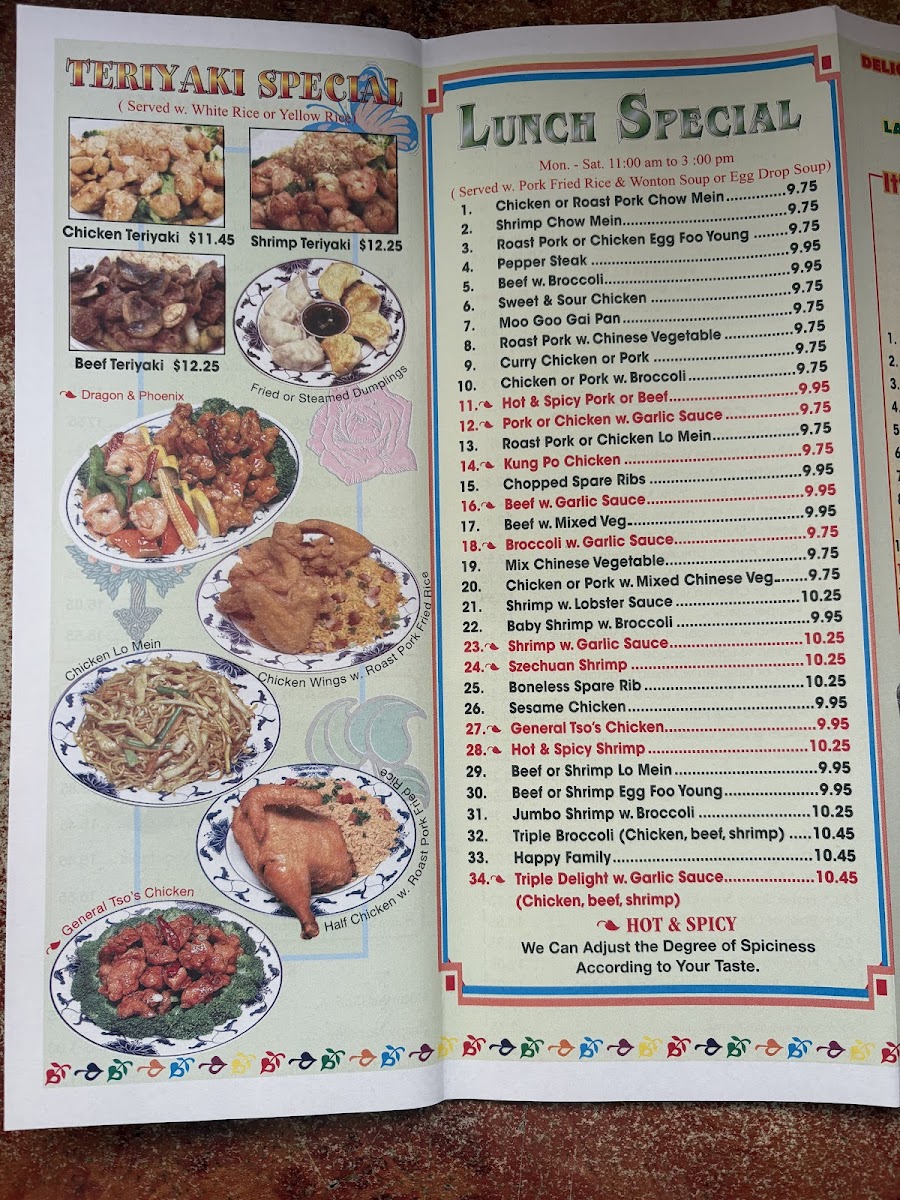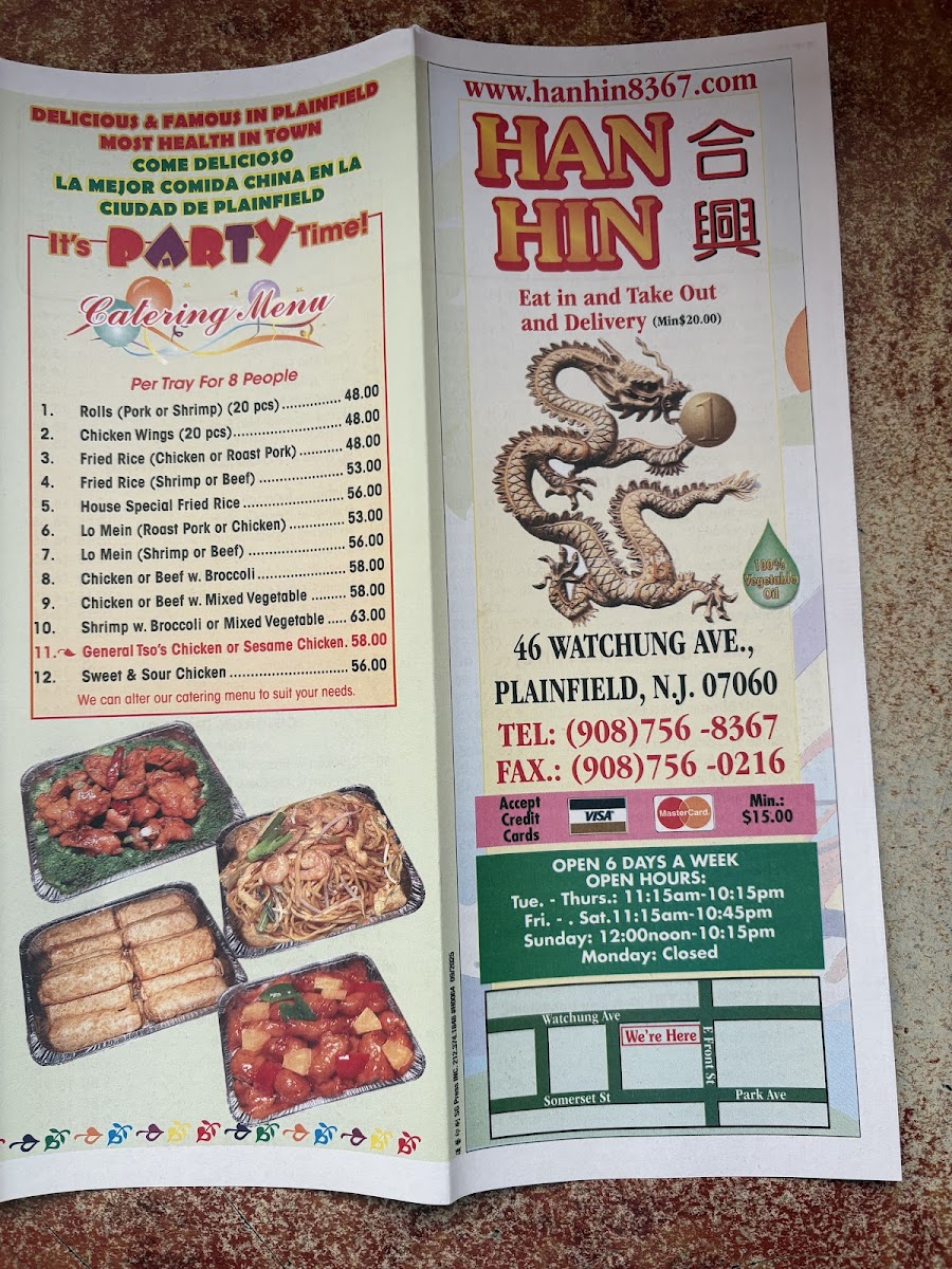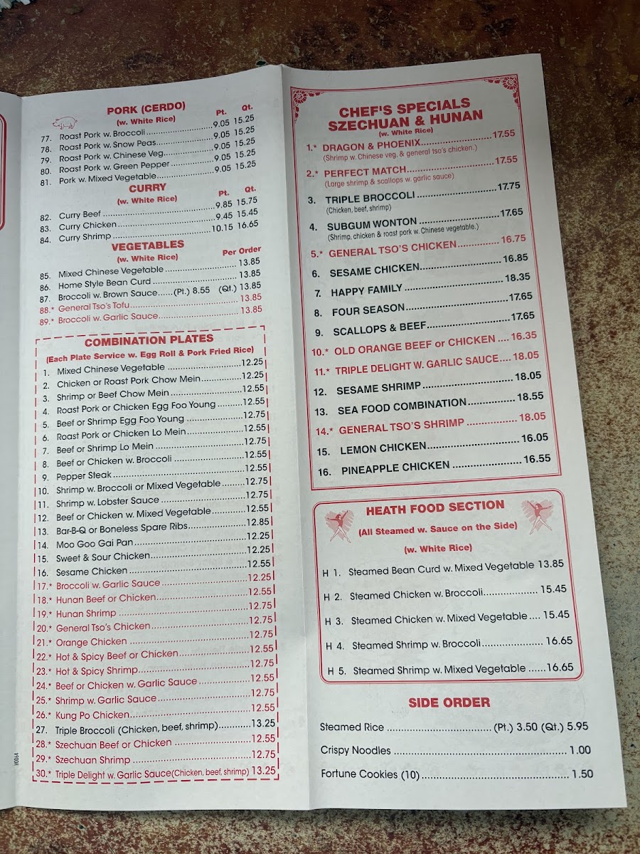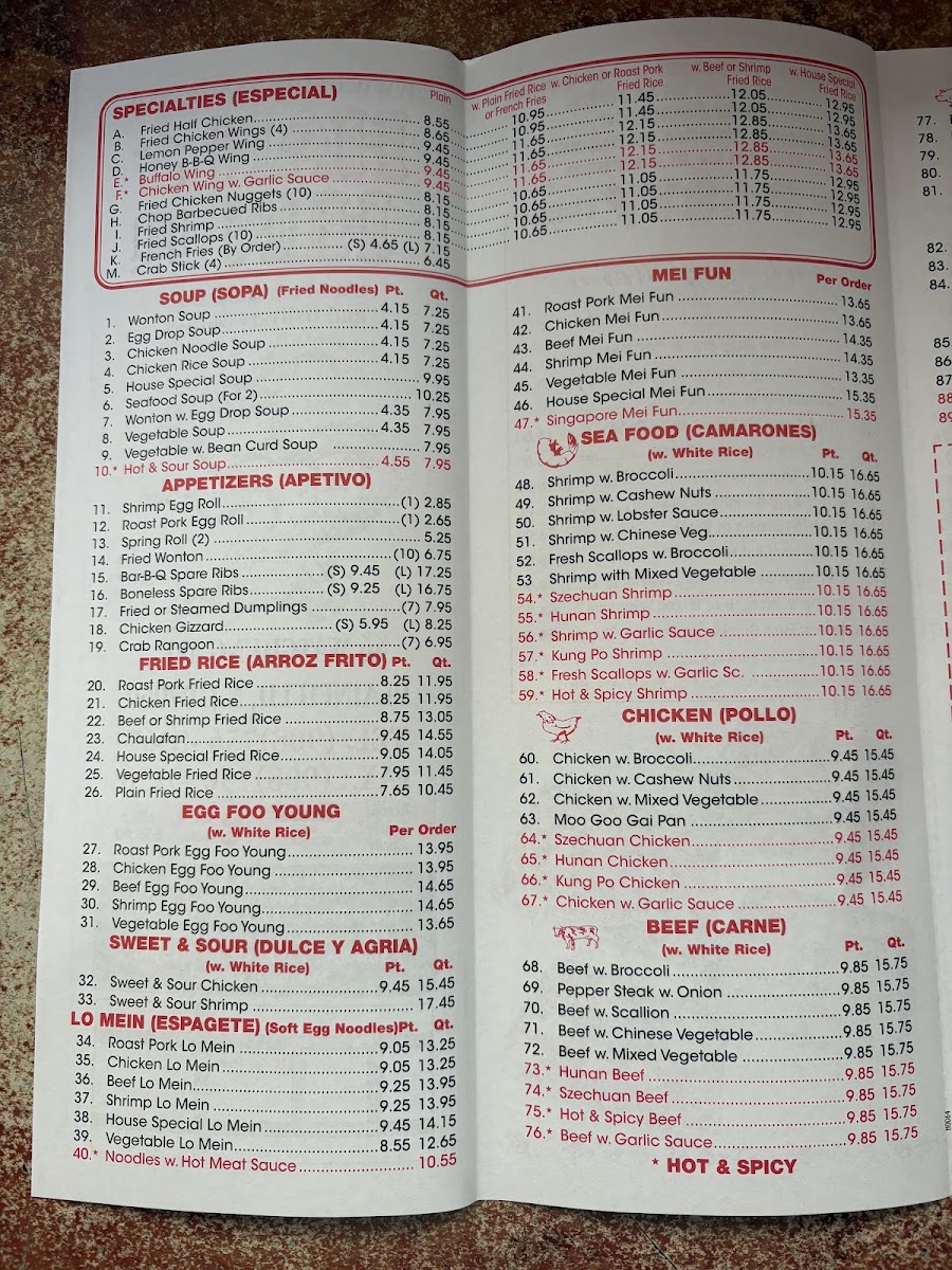 From a reviewer’s perspective, the menu at Han Hin Restaurant offers a wide and satisfying selection of classic Chinese-American dishes, making it easy to find something for every craving. The specialties like Fried Half Chicken, Fried Chicken Wings (4), Honey B-B-Q Wing, and Buffalo Wing are great starters, while comforting soups such as Wonton Soup, Egg Drop Soup, and House Special Soup round out the appetizers like Shrimp Egg Roll (1) and Bar-B-Q Spare Ribs. The main menu features dependable favorites including Roast Pork Fried Rice, Chicken Lo Mein, Shrimp Mei Fun, Sweet & Sour Chicken, Beef W. Broccoli, and Moo Goo Gai Pan, along with chef highlights like General Tso's Chicken and Dragon & Phoenix. Health-conscious diners can opt for Steamed Chicken W. Broccoli or Steamed Shrimp W. Mixed Vegetable, while combination plates such as Chicken Chow Mein (Combo Plate) offer good value. Overall, the menu is extensive, familiar, and reasonably structured, making it a reliable choice for both quick lunches and hearty dinners.